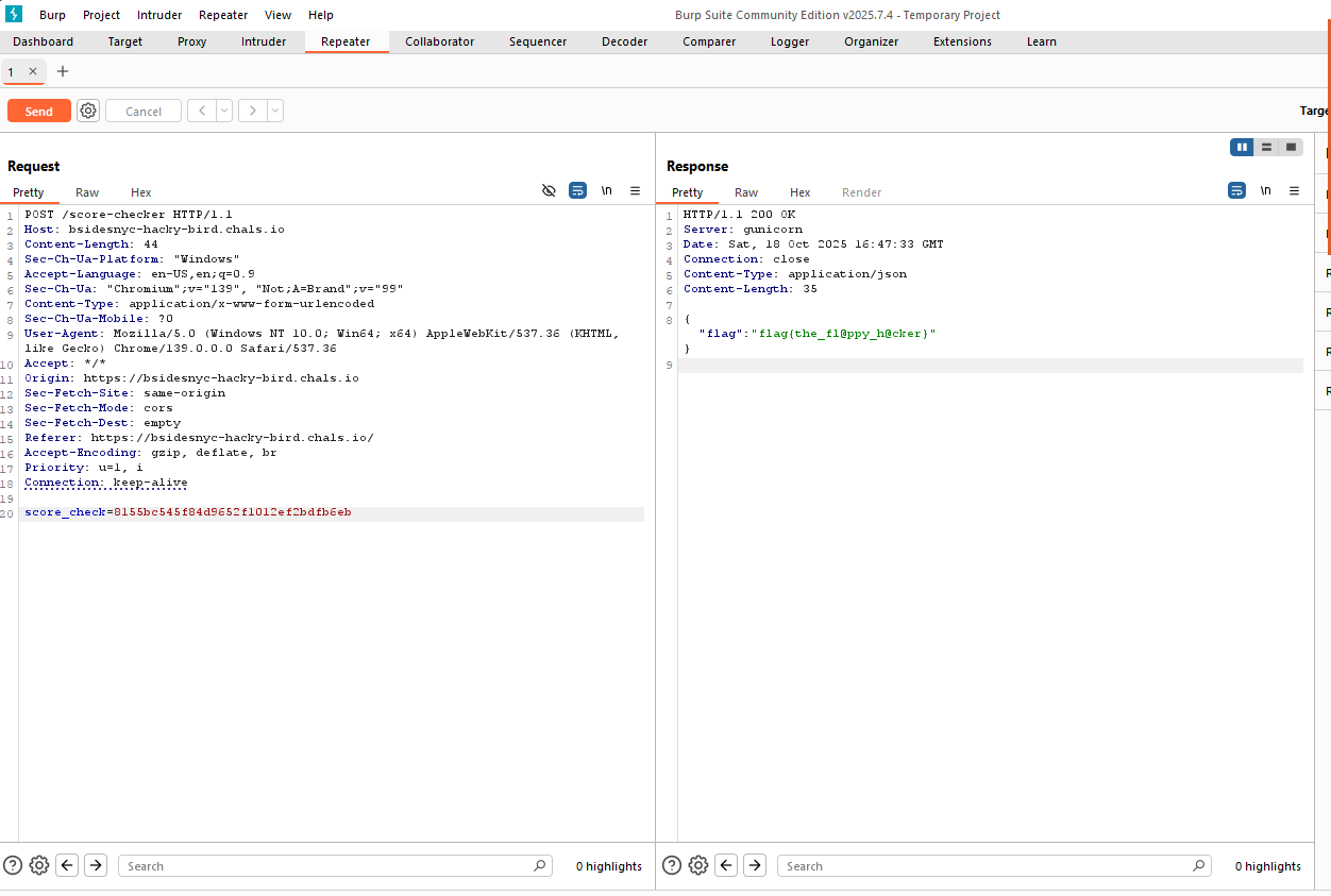 Modify and Send the Request: The original HTTP request was sent to Burp Repeater. The value of the score_check parameter was replaced with our newly generated hash. The modified request looked like this: